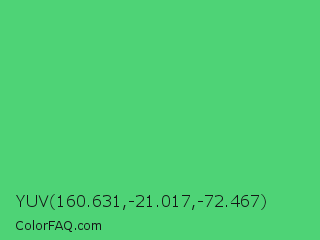 YUV 160.631,-21.017,-72.467 Color is a normal green color and the nearest color is Emerald #50c878. Hex code #4ed376 and RGB value is rgb(78,211,118). In RGB color space, this color is composed of 31% red, 83% green, 46% blue, In CMYK color space, this color is composed of 63% cyan, 0% magenta, 44% yellow , 17% black , In HSL color space, this color has a hue angle of 138° , 60% saturation and 57% lightness.