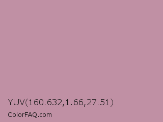 YUV 160.632,1.66,27.51 Color is a light rose color and the nearest color is Viola #cb8fa9. Hex code #c090a4 and RGB value is rgb(192,144,164). In RGB color space, this color is composed of 75% red, 56% green, 64% blue, In CMYK color space, this color is composed of 0% cyan, 25% magenta, 15% yellow , 25% black , In HSL color space, this color has a hue angle of 335° , 28% saturation and 66% lightness.