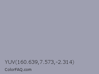 YUV 160.639,7.573,-2.314 Color is a light blue color and the nearest color is Santas Gray #9fa0b1. Hex code #9e9fb0 and RGB value is rgb(158,159,176). In RGB color space, this color is composed of 62% red, 62% green, 69% blue, In CMYK color space, this color is composed of 10% cyan, 10% magenta, 0% yellow , 31% black , In HSL color space, this color has a hue angle of 237° , 10% saturation and 65% lightness.
