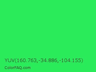 YUV 160.763,-34.886,-104.155 Color is a normal green color and the nearest color is Malachite #0bda51. Hex code #2aeb5a and RGB value is rgb(42,235,90). In RGB color space, this color is composed of 16% red, 92% green, 35% blue, In CMYK color space, this color is composed of 82% cyan, 0% magenta, 62% yellow , 8% black , In HSL color space, this color has a hue angle of 135° , 83% saturation and 54% lightness.