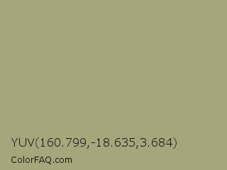 YUV 160.799,-18.635,3.684 Color is a normal yellow color and the nearest color is Hillary #aca586. Hex code #a5a67b and RGB value is rgb(165,166,123). In RGB color space, this color is composed of 65% red, 65% green, 48% blue, In CMYK color space, this color is composed of 1% cyan, 0% magenta, 26% yellow , 35% black , In HSL color space, this color has a hue angle of 61° , 19% saturation and 57% lightness.