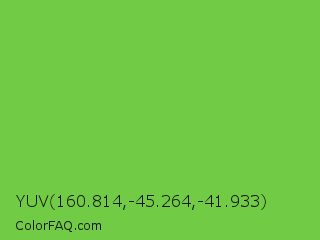 YUV 160.814,-45.264,-41.933 Color is a normal green color and the nearest color is Mantis #74c365. Hex code #71cb45 and RGB value is rgb(113,203,69). In RGB color space, this color is composed of 44% red, 80% green, 27% blue, In CMYK color space, this color is composed of 44% cyan, 0% magenta, 66% yellow , 20% black , In HSL color space, this color has a hue angle of 100° , 56% saturation and 53% lightness.