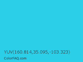 YUV 160.814,35.095,-103.323 Color is a normal cyan color and the nearest color is Scooter #2ebfd4. Hex code #2bcfe8 and RGB value is rgb(43,207,232). In RGB color space, this color is composed of 17% red, 81% green, 91% blue, In CMYK color space, this color is composed of 81% cyan, 11% magenta, 0% yellow , 9% black , In HSL color space, this color has a hue angle of 188° , 80% saturation and 54% lightness.