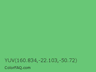 YUV 160.834,-22.103,-50.72 Color is a normal green color and the nearest color is Iguana Green #71bc78. Hex code #67c774 and RGB value is rgb(103,199,116). In RGB color space, this color is composed of 40% red, 78% green, 45% blue, In CMYK color space, this color is composed of 48% cyan, 0% magenta, 42% yellow , 22% black , In HSL color space, this color has a hue angle of 128° , 46% saturation and 59% lightness.