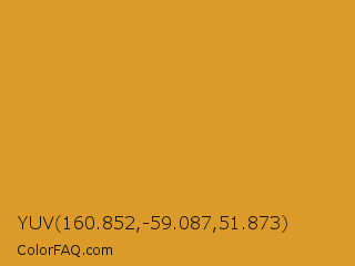 YUV 160.852,-59.087,51.873 Color is a normal orange color and the nearest color is Fire Bush #e89928. Hex code #dc9a29 and RGB value is rgb(220,154,41). In RGB color space, this color is composed of 86% red, 60% green, 16% blue, In CMYK color space, this color is composed of 0% cyan, 30% magenta, 81% yellow , 14% black , In HSL color space, this color has a hue angle of 38° , 72% saturation and 51% lightness.