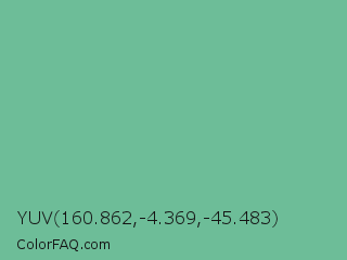 YUV 160.862,-4.369,-45.483 Color is a normal green color and the nearest color is Silver Tree #66b58f. Hex code #6dbd98 and RGB value is rgb(109,189,152). In RGB color space, this color is composed of 43% red, 74% green, 60% blue, In CMYK color space, this color is composed of 42% cyan, 0% magenta, 20% yellow , 26% black , In HSL color space, this color has a hue angle of 152° , 38% saturation and 58% lightness.