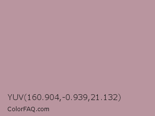 YUV 160.904,-0.939,21.132 Color is a light rose color and the nearest color is Tuscany #c09999. Hex code #b9959f and RGB value is rgb(185,149,159). In RGB color space, this color is composed of 73% red, 58% green, 62% blue, In CMYK color space, this color is composed of 0% cyan, 19% magenta, 14% yellow , 27% black , In HSL color space, this color has a hue angle of 343° , 20% saturation and 65% lightness.