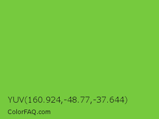YUV 160.924,-48.77,-37.644 Color is a normal green color and the nearest color is Green RYB #66b032. Hex code #76ca3e and RGB value is rgb(118,202,62). In RGB color space, this color is composed of 46% red, 79% green, 24% blue, In CMYK color space, this color is composed of 42% cyan, 0% magenta, 69% yellow , 21% black , In HSL color space, this color has a hue angle of 96° , 57% saturation and 52% lightness.
