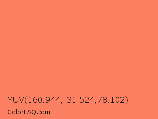 YUV 160.944,-31.524,78.102 Color is a light red color and the nearest color is Coral Reef Hipster Salmon #fd7c6e. Hex code #fa8061 and RGB value is rgb(250,128,97). In RGB color space, this color is composed of 98% red, 50% green, 38% blue, In CMYK color space, this color is composed of 0% cyan, 49% magenta, 61% yellow , 2% black , In HSL color space, this color has a hue angle of 12° , 94% saturation and 68% lightness.