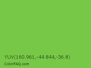YUV 160.961,-44.844,-36.8 Color is a normal green color and the nearest color is Mantis #74c365. Hex code #77c846 and RGB value is rgb(119,200,70). In RGB color space, this color is composed of 47% red, 78% green, 27% blue, In CMYK color space, this color is composed of 41% cyan, 0% magenta, 65% yellow , 22% black , In HSL color space, this color has a hue angle of 97° , 54% saturation and 53% lightness.