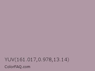 YUV 161.017,0.978,13.14 Color is a light rose color and the nearest color is Lilac Luster #ae98aa. Hex code #b099a3 and RGB value is rgb(176,153,163). In RGB color space, this color is composed of 69% red, 60% green, 64% blue, In CMYK color space, this color is composed of 0% cyan, 13% magenta, 7% yellow , 31% black , In HSL color space, this color has a hue angle of 334° , 13% saturation and 65% lightness.