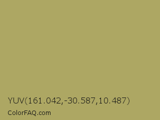 YUV 161.042,-30.587,10.487 Color is a normal yellow color and the nearest color is Husk #b7a458. Hex code #ada763 and RGB value is rgb(173,167,99). In RGB color space, this color is composed of 68% red, 65% green, 39% blue, In CMYK color space, this color is composed of 0% cyan, 3% magenta, 43% yellow , 32% black , In HSL color space, this color has a hue angle of 55° , 31% saturation and 53% lightness.