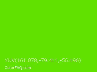 YUV 161.078,-79.411,-56.196 Color is a normal green color and the nearest color is Bright Green #66ff00. Hex code #61e100 and RGB value is rgb(97,225,-0). In RGB color space, this color is composed of 38% red, 88% green, 0% blue, In CMYK color space, this color is composed of 57% cyan, 0% magenta, 100% yellow , 12% black , In HSL color space, this color has a hue angle of 94° , 100% saturation and 44% lightness.