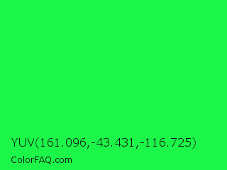 YUV 161.096,-43.431,-116.725 Color is a normal green color and the nearest color is Malachite #0bda51. Hex code #1cf649 and RGB value is rgb(28,246,73). In RGB color space, this color is composed of 11% red, 96% green, 29% blue, In CMYK color space, this color is composed of 89% cyan, 0% magenta, 70% yellow , 4% black , In HSL color space, this color has a hue angle of 132° , 92% saturation and 54% lightness.