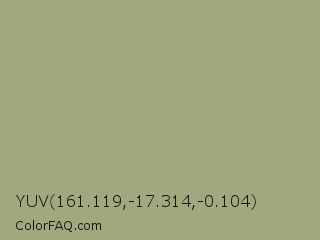 YUV 161.119,-17.314,-0.104 Color is a normal yellow color and the nearest color is Sage #9ea587. Hex code #a1a87e and RGB value is rgb(161,168,126). In RGB color space, this color is composed of 63% red, 66% green, 49% blue, In CMYK color space, this color is composed of 4% cyan, 0% magenta, 25% yellow , 34% black , In HSL color space, this color has a hue angle of 70° , 19% saturation and 58% lightness.