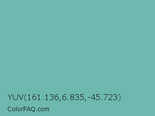 YUV 161.136,6.835,-45.723 Color is a normal cyan color and the nearest color is Tradewind #5fb3ac. Hex code #6db9af and RGB value is rgb(109,185,175). In RGB color space, this color is composed of 43% red, 73% green, 69% blue, In CMYK color space, this color is composed of 41% cyan, 0% magenta, 5% yellow , 27% black , In HSL color space, this color has a hue angle of 172° , 35% saturation and 58% lightness.