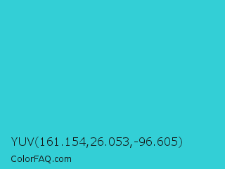 YUV 161.154,26.053,-96.605 Color is a normal cyan color and the nearest color is Turquoise PWG #30d5c8. Hex code #33cfd6 and RGB value is rgb(51,207,214). In RGB color space, this color is composed of 20% red, 81% green, 84% blue, In CMYK color space, this color is composed of 76% cyan, 3% magenta, 0% yellow , 16% black , In HSL color space, this color has a hue angle of 183° , 67% saturation and 52% lightness.