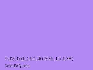 YUV 161.169,40.836,15.638 Color is a light violet color and the nearest color is Bright Lavender #bf94e4. Hex code #b388f4 and RGB value is rgb(179,136,244). In RGB color space, this color is composed of 70% red, 53% green, 96% blue, In CMYK color space, this color is composed of 27% cyan, 44% magenta, 0% yellow , 4% black , In HSL color space, this color has a hue angle of 264° , 83% saturation and 75% lightness.