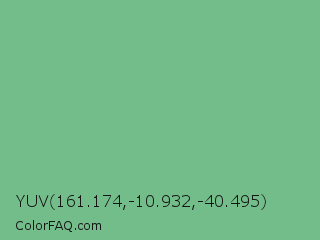YUV 161.174,-10.932,-40.495 Color is a normal green color and the nearest color is De York #7ac488. Hex code #73bd8b and RGB value is rgb(115,189,139). In RGB color space, this color is composed of 45% red, 74% green, 55% blue, In CMYK color space, this color is composed of 39% cyan, 0% magenta, 26% yellow , 26% black , In HSL color space, this color has a hue angle of 139° , 36% saturation and 60% lightness.