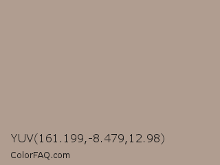 YUV 161.199,-8.479,12.98 Color is a light orange color and the nearest color is Del Rio #b09a95. Hex code #b09d90 and RGB value is rgb(176,157,144). In RGB color space, this color is composed of 69% red, 62% green, 56% blue, In CMYK color space, this color is composed of 0% cyan, 11% magenta, 18% yellow , 31% black , In HSL color space, this color has a hue angle of 24° , 17% saturation and 63% lightness.