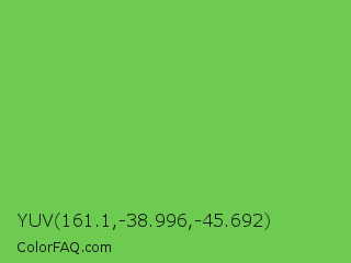 YUV 161.1,-38.996,-45.692 Color is a normal green color and the nearest color is Mantis #74c365. Hex code #6dcb52 and RGB value is rgb(109,203,82). In RGB color space, this color is composed of 43% red, 80% green, 32% blue, In CMYK color space, this color is composed of 46% cyan, 0% magenta, 60% yellow , 20% black , In HSL color space, this color has a hue angle of 107° , 54% saturation and 56% lightness.