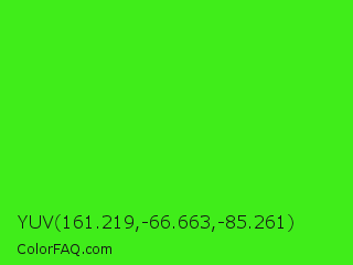 YUV 161.219,-66.663,-85.261 Color is a normal green color and the nearest color is Neon Green #39ff14. Hex code #40ed1a and RGB value is rgb(64,237,26). In RGB color space, this color is composed of 25% red, 93% green, 10% blue, In CMYK color space, this color is composed of 73% cyan, 0% magenta, 89% yellow , 7% black , In HSL color space, this color has a hue angle of 109° , 85% saturation and 52% lightness.
