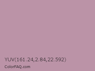 YUV 161.24,2.84,22.592 Color is a light rose color and the nearest color is Lilac Luster #ae98aa. Hex code #bb93a7 and RGB value is rgb(187,147,167). In RGB color space, this color is composed of 73% red, 58% green, 65% blue, In CMYK color space, this color is composed of 0% cyan, 21% magenta, 11% yellow , 27% black , In HSL color space, this color has a hue angle of 330° , 23% saturation and 65% lightness.