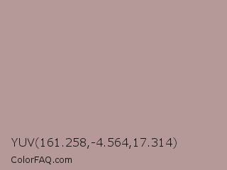 YUV 161.258,-4.564,17.314 Color is a light red color and the nearest color is Thatch #b69d98. Hex code #b59998 and RGB value is rgb(181,153,152). In RGB color space, this color is composed of 71% red, 60% green, 60% blue, In CMYK color space, this color is composed of 0% cyan, 15% magenta, 16% yellow , 29% black , In HSL color space, this color has a hue angle of 2° , 16% saturation and 65% lightness.