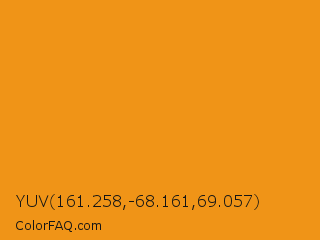 YUV 161.258,-68.161,69.057 Color is a normal orange color and the nearest color is Carrot Orange #ed9121. Hex code #f09417 and RGB value is rgb(240,148,23). In RGB color space, this color is composed of 94% red, 58% green, 9% blue, In CMYK color space, this color is composed of 0% cyan, 38% magenta, 90% yellow , 6% black , In HSL color space, this color has a hue angle of 35° , 88% saturation and 52% lightness.