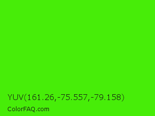YUV 161.26,-75.557,-79.158 Color is a normal green color and the nearest color is Chlorophyll Green #4aff00. Hex code #47ed08 and RGB value is rgb(71,237,8). In RGB color space, this color is composed of 28% red, 93% green, 3% blue, In CMYK color space, this color is composed of 70% cyan, 0% magenta, 97% yellow , 7% black , In HSL color space, this color has a hue angle of 103° , 93% saturation and 48% lightness.