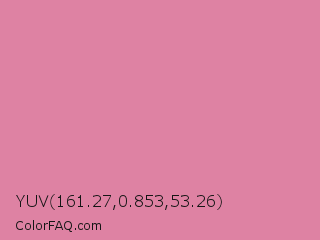 YUV 161.27,0.853,53.26 Color is a light rose color and the nearest color is Carissma #ea88a8. Hex code #de82a3 and RGB value is rgb(222,130,163). In RGB color space, this color is composed of 87% red, 51% green, 64% blue, In CMYK color space, this color is composed of 0% cyan, 41% magenta, 27% yellow , 13% black , In HSL color space, this color has a hue angle of 338° , 58% saturation and 69% lightness.