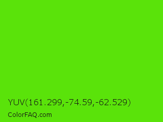 YUV 161.299,-74.59,-62.529 Color is a normal green color and the nearest color is Bright Green #66ff00. Hex code #5ae30a and RGB value is rgb(90,227,10). In RGB color space, this color is composed of 35% red, 89% green, 4% blue, In CMYK color space, this color is composed of 60% cyan, 0% magenta, 96% yellow , 11% black , In HSL color space, this color has a hue angle of 98° , 92% saturation and 46% lightness.