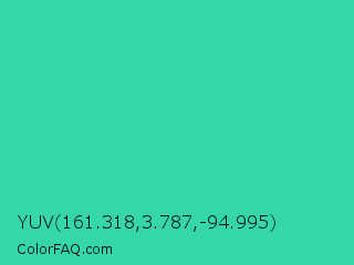 YUV 161.318,3.787,-94.995 Color is a normal green color and the nearest color is Eucalyptus #44d7a8. Hex code #35d7a9 and RGB value is rgb(53,215,169). In RGB color space, this color is composed of 21% red, 84% green, 66% blue, In CMYK color space, this color is composed of 75% cyan, 0% magenta, 21% yellow , 16% black , In HSL color space, this color has a hue angle of 163° , 67% saturation and 53% lightness.