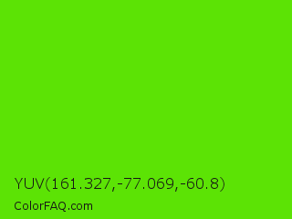 YUV 161.327,-77.069,-60.8 Color is a normal green color and the nearest color is Bright Green #66ff00. Hex code #5ce305 and RGB value is rgb(92,227,5). In RGB color space, this color is composed of 36% red, 89% green, 2% blue, In CMYK color space, this color is composed of 59% cyan, 0% magenta, 98% yellow , 11% black , In HSL color space, this color has a hue angle of 96° , 96% saturation and 45% lightness.