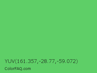 YUV 161.357,-28.77,-59.072 Color is a normal green color and the nearest color is Emerald #50c878. Hex code #5ecf67 and RGB value is rgb(94,207,103). In RGB color space, this color is composed of 37% red, 81% green, 40% blue, In CMYK color space, this color is composed of 55% cyan, 0% magenta, 50% yellow , 19% black , In HSL color space, this color has a hue angle of 125° , 54% saturation and 59% lightness.