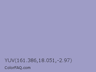 YUV 161.386,18.051,-2.97 Color is a light indigo color and the nearest color is Blue Bell Crayola #9999cc. Hex code #9e9cc6 and RGB value is rgb(158,156,198). In RGB color space, this color is composed of 62% red, 61% green, 78% blue, In CMYK color space, this color is composed of 20% cyan, 21% magenta, 0% yellow , 22% black , In HSL color space, this color has a hue angle of 243° , 27% saturation and 69% lightness.
