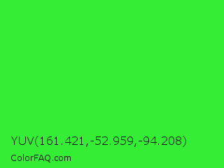 YUV 161.421,-52.959,-94.208 Color is a normal green color and the nearest color is Lime Green #32cd32. Hex code #36ed36 and RGB value is rgb(54,237,54). In RGB color space, this color is composed of 21% red, 93% green, 21% blue, In CMYK color space, this color is composed of 77% cyan, 0% magenta, 77% yellow , 7% black , In HSL color space, this color has a hue angle of 120° , 84% saturation and 57% lightness.