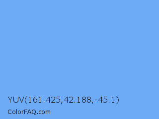 YUV 161.425,42.188,-45.1 Color is a light blue color and the nearest color is French Sky Blue #77b5fe. Hex code #6eabf7 and RGB value is rgb(110,171,247). In RGB color space, this color is composed of 43% red, 67% green, 97% blue, In CMYK color space, this color is composed of 55% cyan, 31% magenta, 0% yellow , 3% black , In HSL color space, this color has a hue angle of 213° , 90% saturation and 70% lightness.