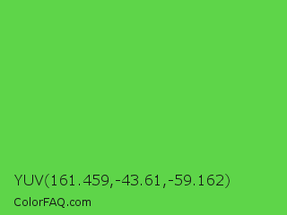 YUV 161.459,-43.61,-59.162 Color is a normal green color and the nearest color is Mantis #74c365. Hex code #5ed549 and RGB value is rgb(94,213,73). In RGB color space, this color is composed of 37% red, 84% green, 29% blue, In CMYK color space, this color is composed of 56% cyan, 0% magenta, 66% yellow , 16% black , In HSL color space, this color has a hue angle of 111° , 63% saturation and 56% lightness.