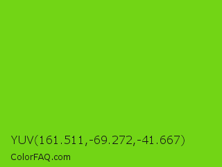 YUV 161.511,-69.272,-41.667 Color is a normal green color and the nearest color is Lima #76bd17. Hex code #72d515 and RGB value is rgb(114,213,21). In RGB color space, this color is composed of 45% red, 84% green, 8% blue, In CMYK color space, this color is composed of 46% cyan, 0% magenta, 90% yellow , 16% black , In HSL color space, this color has a hue angle of 91° , 82% saturation and 46% lightness.