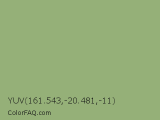 YUV 161.543,-20.481,-11 Color is a normal green color and the nearest color is Olivine #9ab973. Hex code #95b078 and RGB value is rgb(149,176,120). In RGB color space, this color is composed of 58% red, 69% green, 47% blue, In CMYK color space, this color is composed of 15% cyan, 0% magenta, 32% yellow , 31% black , In HSL color space, this color has a hue angle of 89° , 26% saturation and 58% lightness.