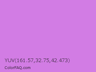 YUV 161.57,32.75,42.473 Color is a light purple color and the nearest color is French Mauve #d473d4. Hex code #d27ce4 and RGB value is rgb(210,124,228). In RGB color space, this color is composed of 82% red, 49% green, 89% blue, In CMYK color space, this color is composed of 8% cyan, 46% magenta, 0% yellow , 11% black , In HSL color space, this color has a hue angle of 290° , 66% saturation and 69% lightness.