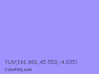YUV 161.601,45.553,-4.035 Color is a light indigo color and the nearest color is Dull Lavender #a899e6. Hex code #9d92fe and RGB value is rgb(157,146,254). In RGB color space, this color is composed of 62% red, 57% green, 100% blue, In CMYK color space, this color is composed of 38% cyan, 43% magenta, 0% yellow , 0% black , In HSL color space, this color has a hue angle of 246° , 98% saturation and 78% lightness.