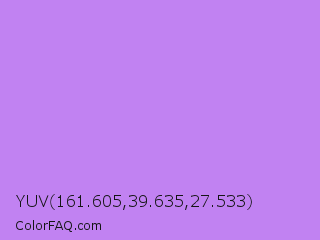 YUV 161.605,39.635,27.533 Color is a light purple color and the nearest color is Bright Lavender #bf94e4. Hex code #c182f2 and RGB value is rgb(193,130,242). In RGB color space, this color is composed of 76% red, 51% green, 95% blue, In CMYK color space, this color is composed of 20% cyan, 46% magenta, 0% yellow , 5% black , In HSL color space, this color has a hue angle of 274° , 81% saturation and 73% lightness.