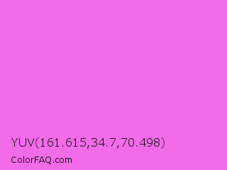 YUV 161.615,34.7,70.498 Color is a light magenta color and the nearest color is Lavender Magenta #ee82ee. Hex code #f26be8 and RGB value is rgb(242,107,232). In RGB color space, this color is composed of 95% red, 42% green, 91% blue, In CMYK color space, this color is composed of 0% cyan, 56% magenta, 4% yellow , 5% black , In HSL color space, this color has a hue angle of 304° , 84% saturation and 68% lightness.