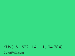 YUV 161.622,-14.111,-94.384 Color is a normal green color and the nearest color is UFO Green #3cd070. Hex code #36de85 and RGB value is rgb(54,222,133). In RGB color space, this color is composed of 21% red, 87% green, 52% blue, In CMYK color space, this color is composed of 76% cyan, 0% magenta, 40% yellow , 13% black , In HSL color space, this color has a hue angle of 148° , 72% saturation and 54% lightness.