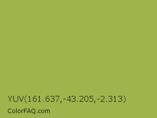 YUV 161.637,-43.205,-2.313 Color is a normal lime color and the nearest color is Android Green #a4c639. Hex code #9fb44a and RGB value is rgb(159,180,74). In RGB color space, this color is composed of 62% red, 71% green, 29% blue, In CMYK color space, this color is composed of 12% cyan, 0% magenta, 59% yellow , 29% black , In HSL color space, this color has a hue angle of 72° , 42% saturation and 50% lightness.