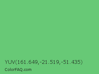 YUV 161.649,-21.519,-51.435 Color is a normal green color and the nearest color is Iguana Green #71bc78. Hex code #67c876 and RGB value is rgb(103,200,118). In RGB color space, this color is composed of 40% red, 78% green, 46% blue, In CMYK color space, this color is composed of 49% cyan, 0% magenta, 41% yellow , 22% black , In HSL color space, this color has a hue angle of 129° , 47% saturation and 59% lightness.