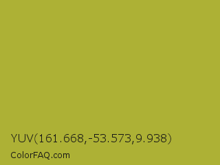 YUV 161.668,-53.573,9.938 Color is a normal yellow color and the nearest color is Brass #b5a642. Hex code #adb135 and RGB value is rgb(173,177,53). In RGB color space, this color is composed of 68% red, 69% green, 21% blue, In CMYK color space, this color is composed of 2% cyan, 0% magenta, 70% yellow , 31% black , In HSL color space, this color has a hue angle of 62° , 54% saturation and 45% lightness.