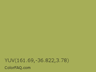 YUV 161.69,-36.822,3.78 Color is a normal yellow color and the nearest color is Olive Green #b5b35c. Hex code #a6ae57 and RGB value is rgb(166,174,87). In RGB color space, this color is composed of 65% red, 68% green, 34% blue, In CMYK color space, this color is composed of 5% cyan, 0% magenta, 50% yellow , 32% black , In HSL color space, this color has a hue angle of 66° , 35% saturation and 51% lightness.